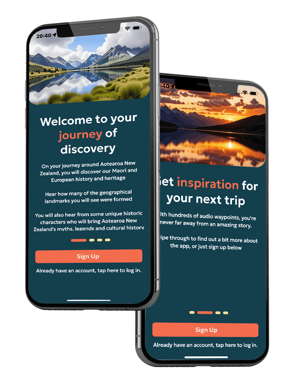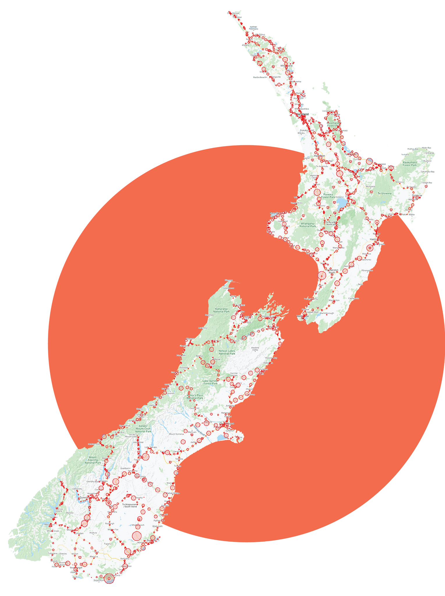 Each red circle on the map marks one of over 1,340 Kruse audio commentary points across Aotearoa New Zealand. As you travel, our GPS guide shares Māori and European history, geological insights, wildlife descriptions, and captivating local stories.